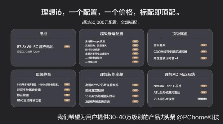 智能化方面,理想i6标配激光雷达、毫米波雷达与高清摄像头,搭配Thor-X芯片,具备强大的环境感知和数据处理能力,支持城市/高速NOA。理想i6搭载理想星环OS系统,配备高通8295芯片,支持AR-HUD抬头显示和语音交互功能。